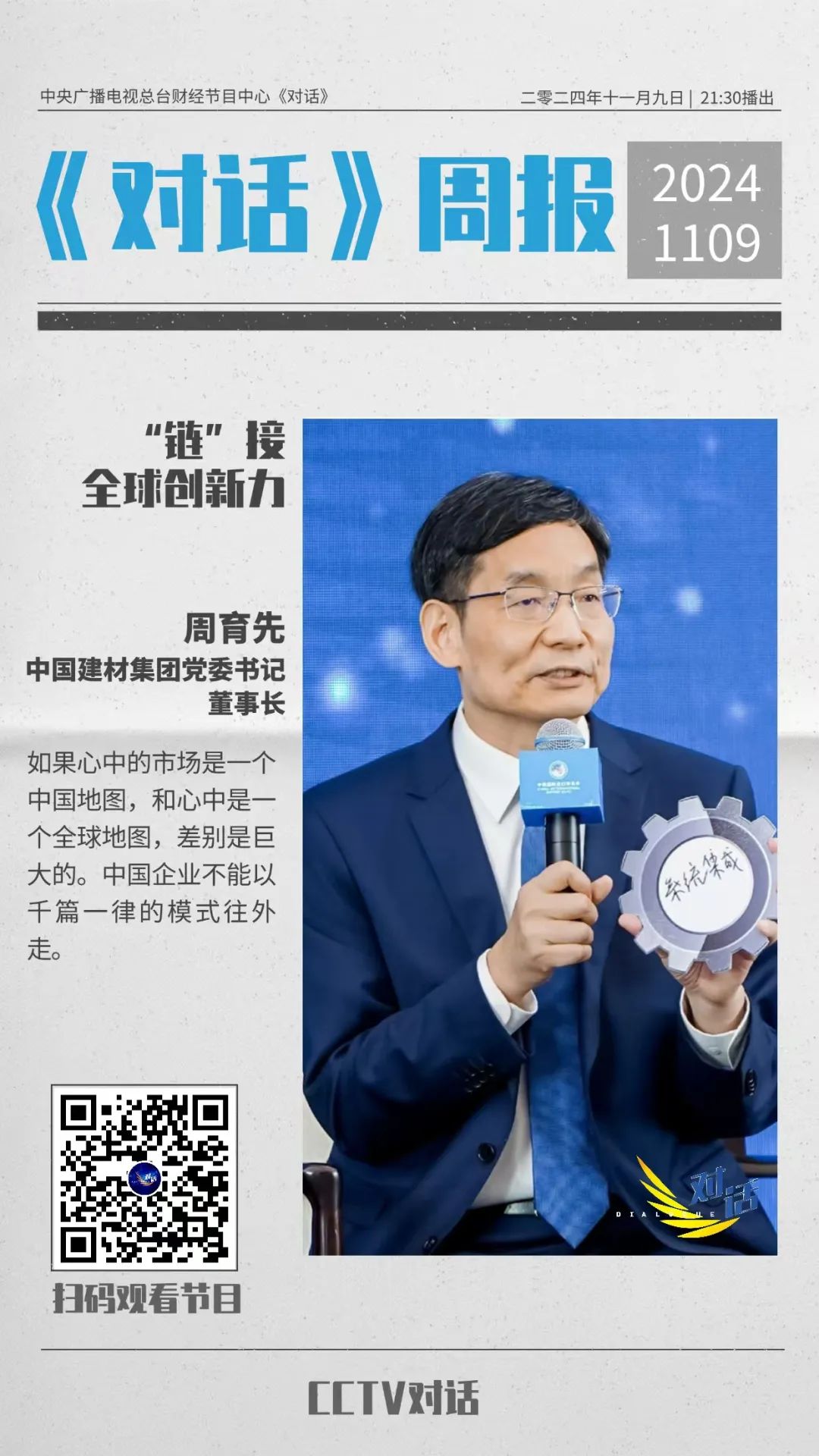 今晚21:30|央視財經(jīng)《對話》:周育先分享中國建材“鏈”接全球、擴大“朋友圈”的思考和實踐