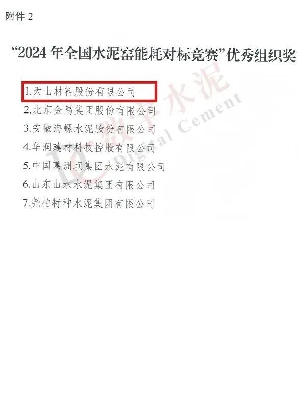來(lái)源:集團(tuán)安全環(huán)保部 發(fā)布時(shí)間:2025-06-266月19日,中國(guó)機(jī)械冶金建材工會(huì)全國(guó)委員會(huì)和中國(guó)水泥協(xié)會(huì)聯(lián)合發(fā)布關(guān)于“2024年全國(guó)水泥窯能耗對(duì)標(biāo)競(jìng)賽”評(píng)審結(jié)果的通報(bào),天山材料及所屬企業(yè)成績(jī)優(yōu)異,榮獲“水泥行業(yè)能效標(biāo)桿窯”“水泥行業(yè)能效示范窯”“水泥行業(yè)能效先進(jìn)窯”“競(jìng)賽優(yōu)秀組織獎(jiǎng)”等4個(gè)獎(jiǎng)項(xiàng)。