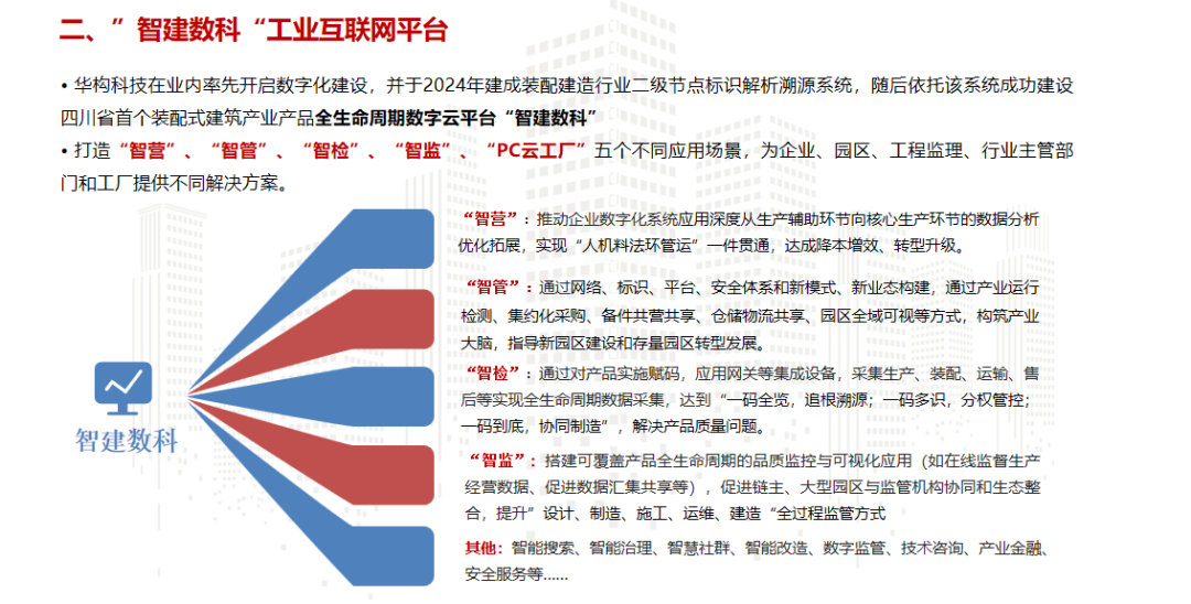 近年來,華構科技在高性能混凝土研究領域取得技術突破并實現(xiàn)落地應用,為轉型發(fā)展奠定了基礎,同時通過積極調整傳統(tǒng)房建業(yè)務占比、加大市政交通領域新產品研發(fā)、全力拓展新能源業(yè)務等舉措,在行業(yè)調整期逐步走出了業(yè)務轉型新路徑。在數(shù)字化建設方面,華構科技通過打造裝配式建筑產業(yè)產品全生命周期數(shù)字云平臺——“智建數(shù)科”,成功建設“智營、智管、智檢、智監(jiān)、PC云工廠”五大應用場景,實現(xiàn)自身智能化工廠升級的同時,為傳統(tǒng)制造企業(yè)、產業(yè)園區(qū)、工程監(jiān)理、政府及協(xié)會提供全生命周期數(shù)字化管理和一體化云供采服務,先后榮獲了國家級國企數(shù)字場景創(chuàng)新三等獎、建材工業(yè)互聯(lián)網(wǎng)示范項目。