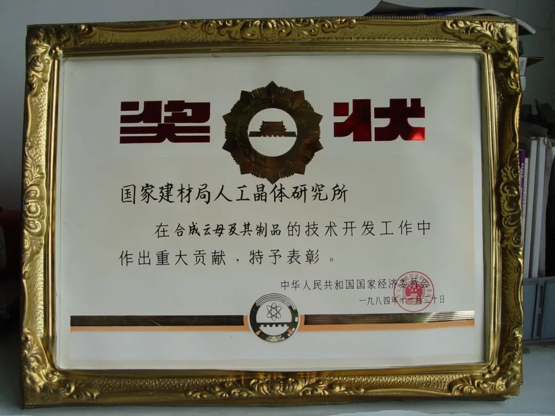 1978年3月,黨中央在北京人民大會堂召開全國科學(xué)大會,研究所所長兼黨委書記張靜之與合成云母項目組組長王國方參加大會。大會授予研究所內(nèi)熱法合成云母組“全國科技先進(jìn)集體”、授予王國方“全國先進(jìn)科技工作者”稱號,并受到時任中共中央主席華國峰、副主席葉劍英、鄧小平、汪東興等國家領(lǐng)導(dǎo)人接見。
